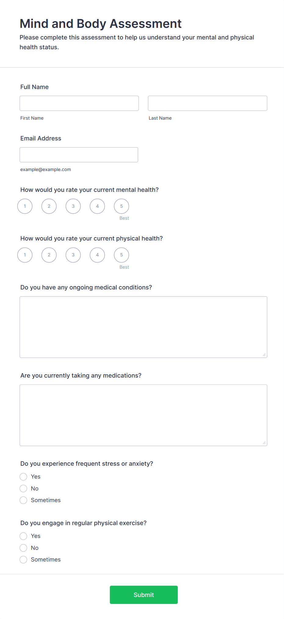 Wellness forms are digital tools designed to collect, track, and manage information related to personal health, well-being, and lifestyle habits. These forms are commonly used by wellness coaches, fitness trainers, healthcare providers, corporate wellness programs, and individuals to monitor aspects such as nutrition, exercise routines, mental health status, sleep patterns, and stress levels. Wellness forms can serve a variety of purposes, including health assessments, daily check-ins, goal tracking, consent collection, and feedback gathering. Their flexibility makes them suitable for use in gyms, clinics, schools, workplaces, and wellness retreats, helping both professionals and individuals stay informed and proactive about health and wellness.