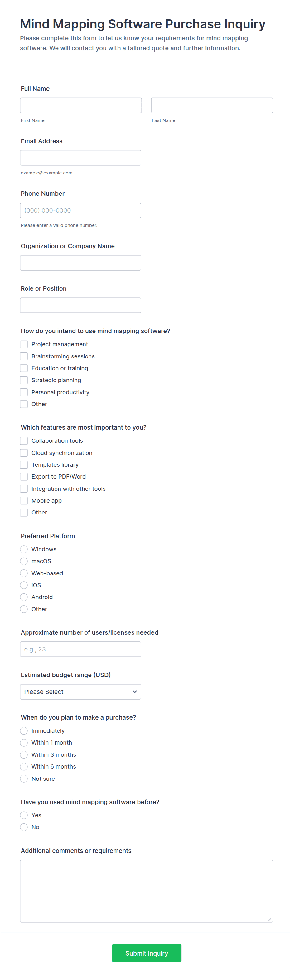 Inquiry Form Templates are versatile tools that can be adapted to a wide range of scenarios, helping organizations efficiently collect and manage incoming questions or requests. Here’s how they can be used, who can benefit, and how their structure may vary: