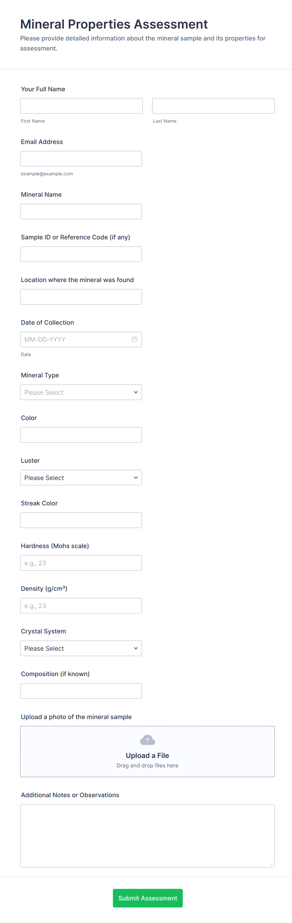 A Mineral Properties Assessment should include sample identification, collection location, date, and observer, as well as fields for color, luster, hardness, streak, cleavage or fracture, specific gravity, special properties, and any additional notes or images.