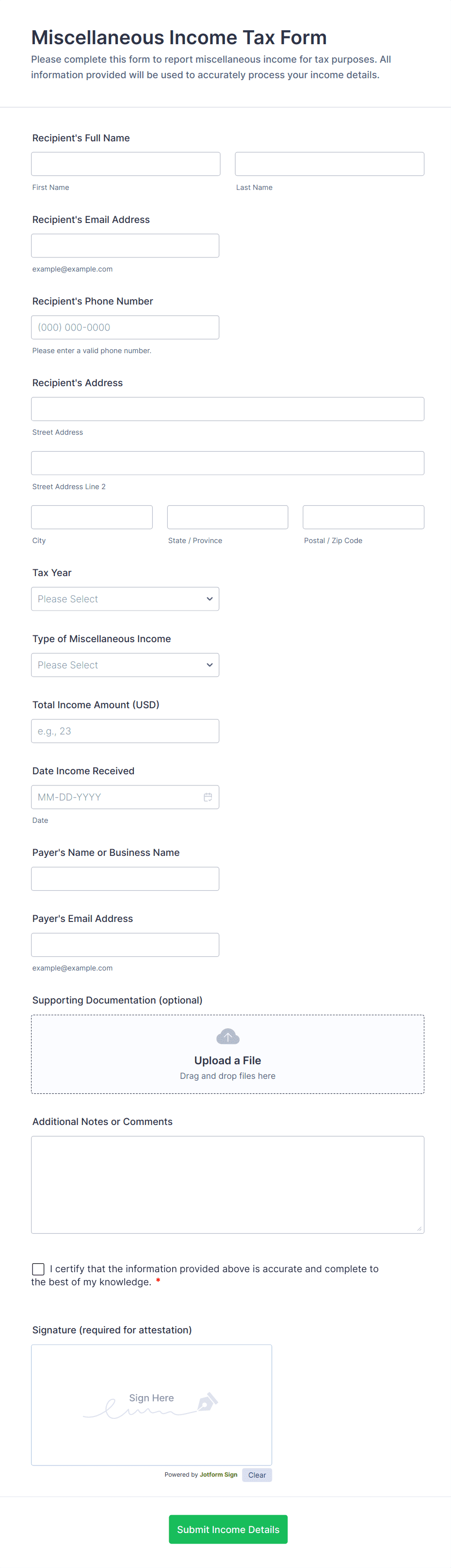 Whether you’re a government agency collecting official tax forms or an accountant gathering information from your clients, securely receive tax information online with Jotform’s Tax Forms! Start by selecting a form template below and customizing it to match your needs and branding. Then share the form or embed it in your website to be filled out on any smartphone, tablet, or computer. Submissions are stored in your secure Jotform account and can be converted into professional PDF documents automatically.