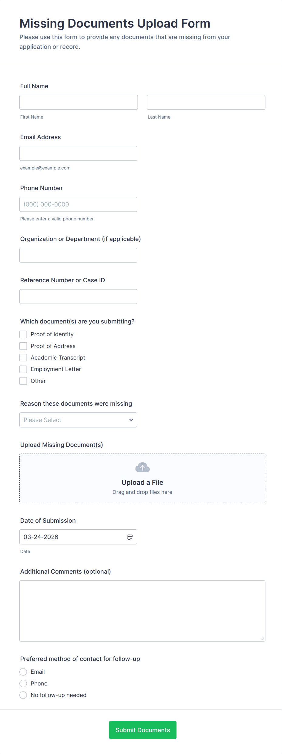 File Upload Forms are specialized online forms designed to collect files, documents, images, or other digital assets directly from users. These forms are commonly used in scenarios where individuals or organizations need to gather supporting materials, such as job applications with resumes, event registrations with ID proofs, homework submissions, design requests, or client onboarding documents. The versatility of File Upload Forms makes them essential for businesses, educational institutions, creative agencies, HR departments, and service providers who require a secure and efficient way to receive files from clients, students, or collaborators.