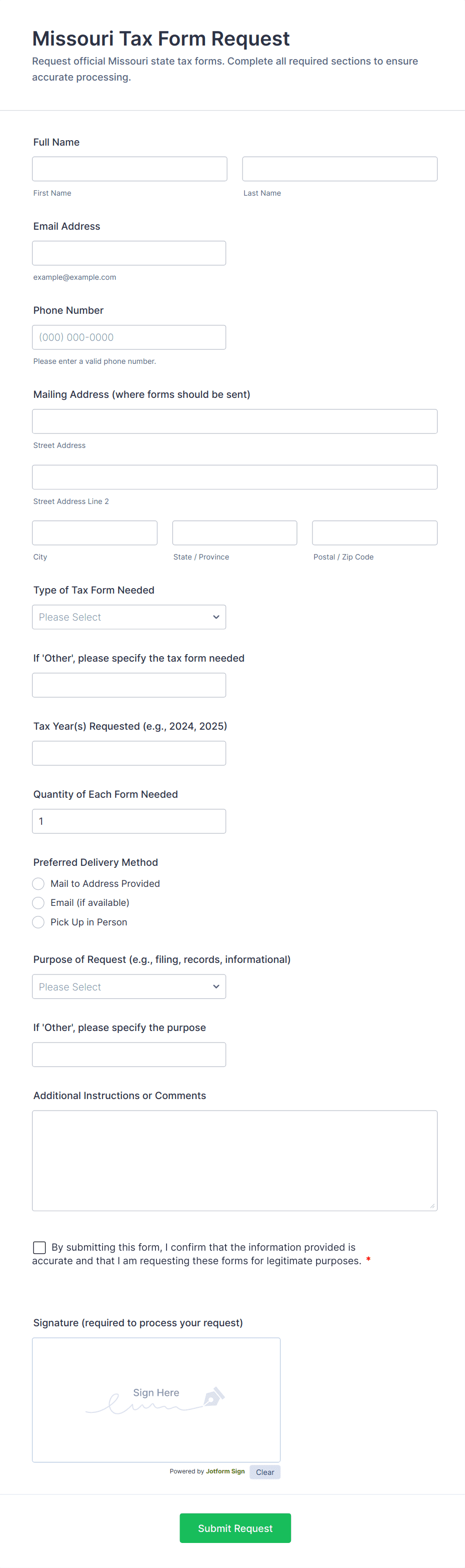 Whether you’re a government agency collecting official tax forms or an accountant gathering information from your clients, securely receive tax information online with Jotform’s Tax Forms! Start by selecting a form template below and customizing it to match your needs and branding. Then share the form or embed it in your website to be filled out on any smartphone, tablet, or computer. Submissions are stored in your secure Jotform account and can be converted into professional PDF documents automatically.