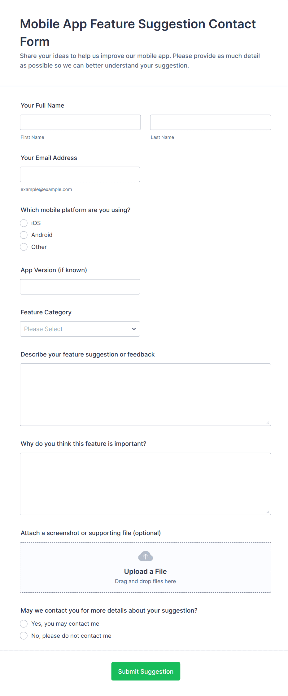 AI Agent Chat Interaction Feedback Form helps product and support teams collect user satisfaction scores and comments about AI chats, turning feedback into insights to improve AI experiences.