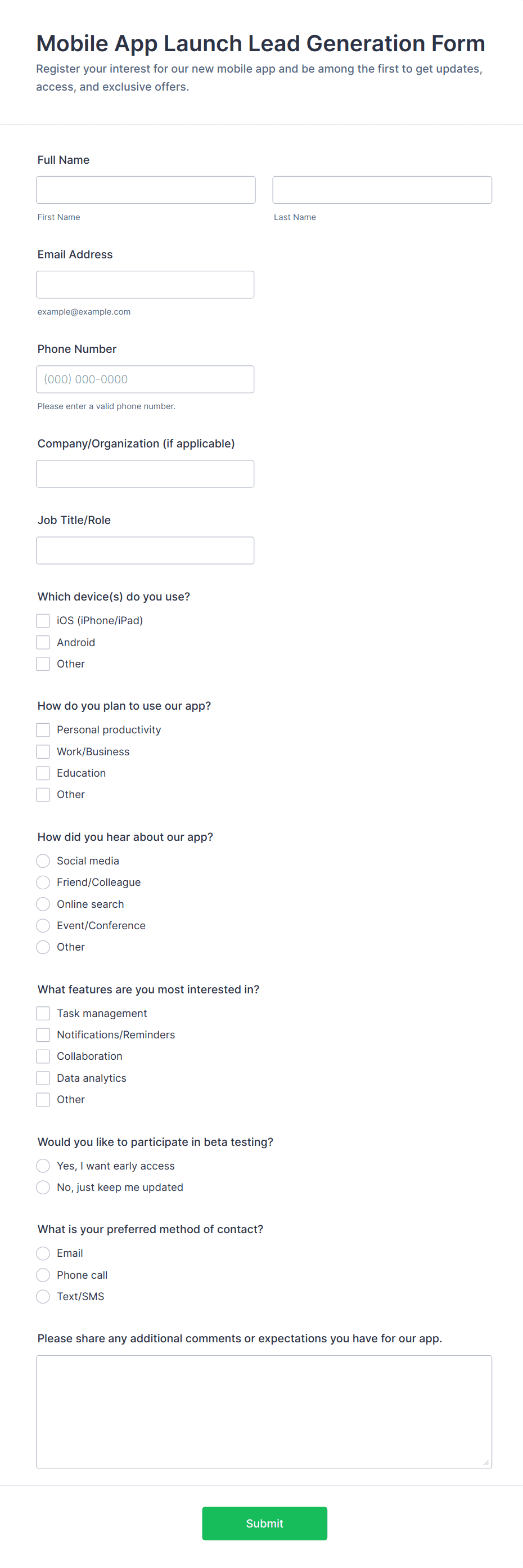 The information you collect depends on your goals, but common fields include name, email address, phone number, company, job title, and specific questions related to your product or service.