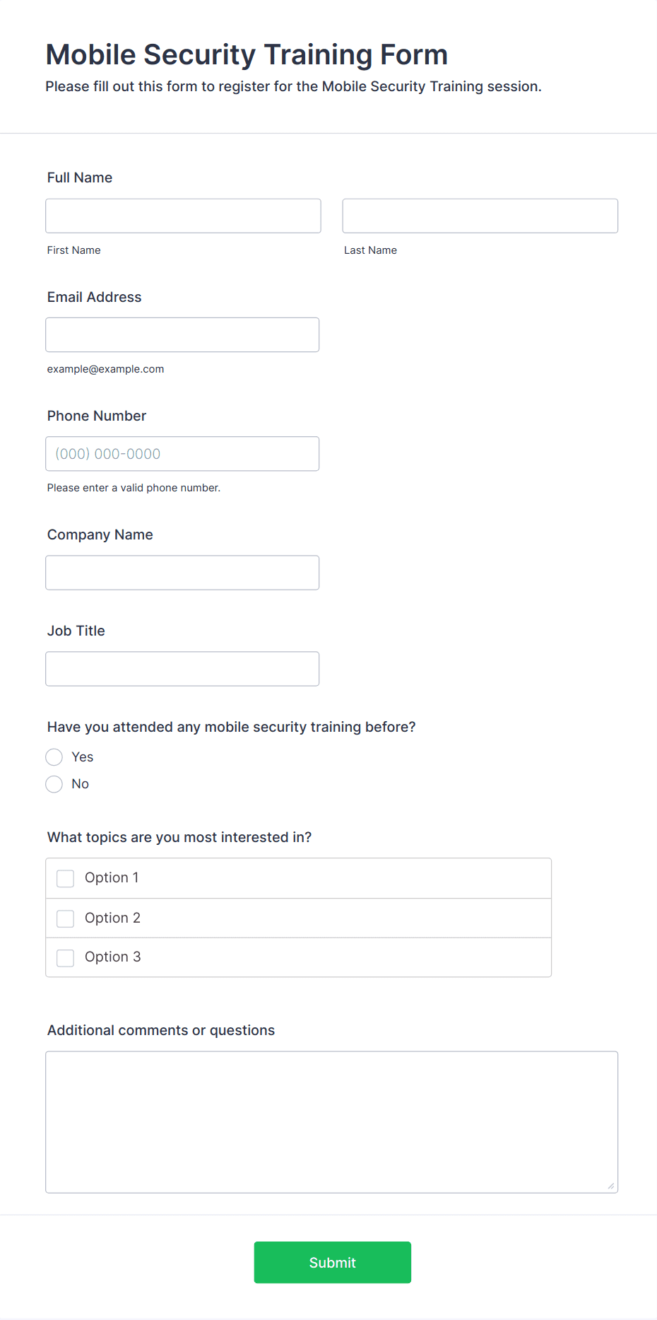 Training forms are specialized digital documents designed to streamline the process of organizing, managing, and evaluating training programs. These forms can be used for a variety of purposes, such as employee onboarding, skills assessments, training feedback, course registrations, pre-training surveys, and post-training evaluations. Organizations of all sizes — from corporate HR departments to educational institutions and training consultants — rely on training forms to collect essential information, track participant progress, and ensure that learning objectives are met efficiently.