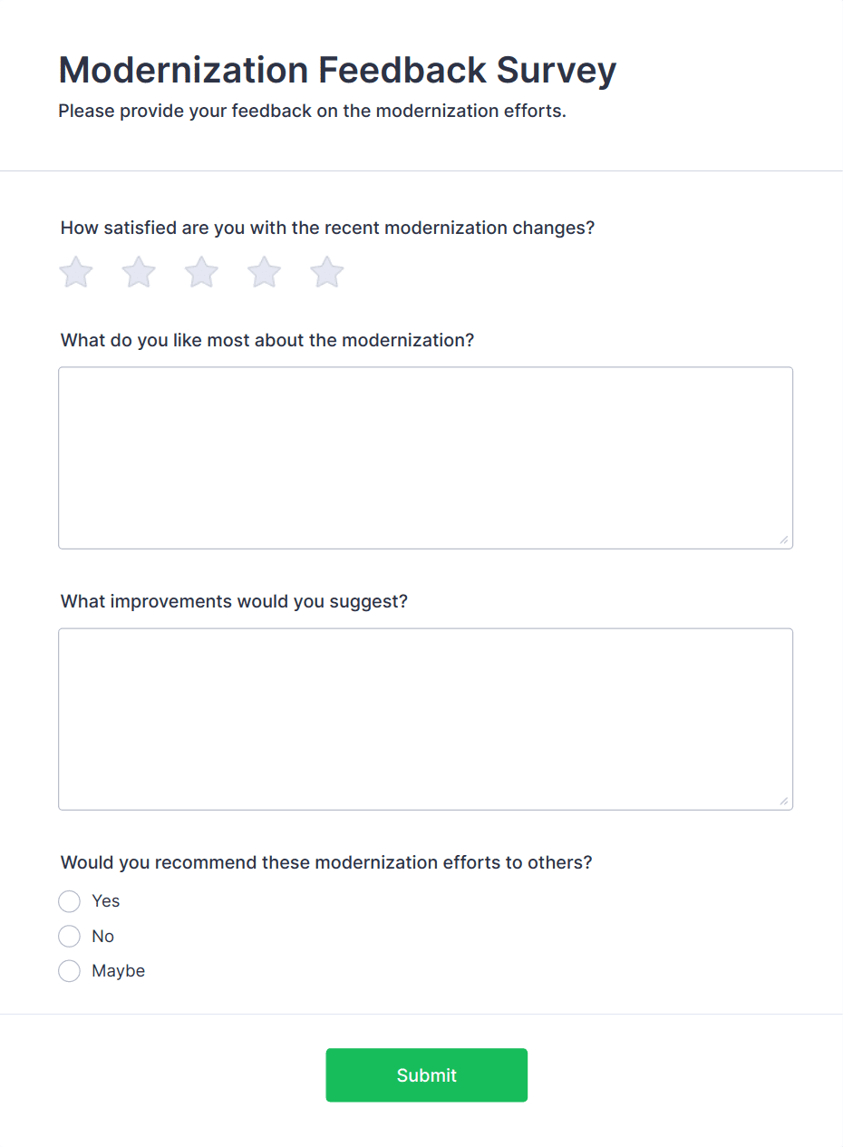 • Product feedback forms may include questions about usability, features, and likelihood to recommend.