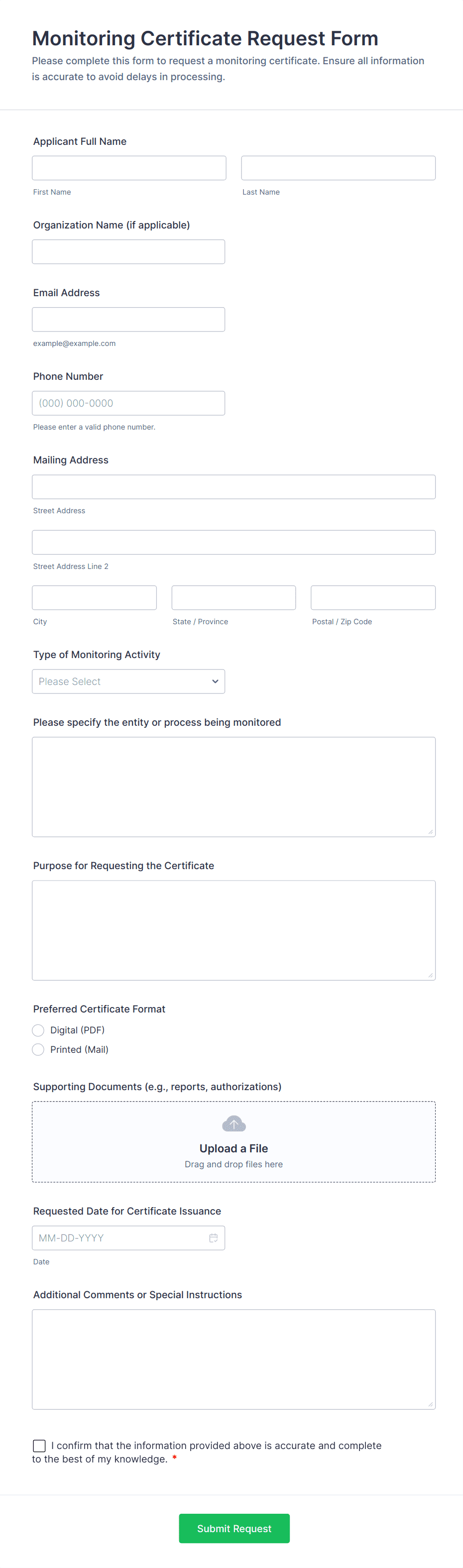 Monitoring Form Templates are specialized digital forms designed to help individuals and organizations systematically track, observe, and record data over time. These templates are commonly used in a variety of settings, such as workplace safety checks, equipment inspections, environmental monitoring, project progress tracking, health and wellness assessments, and compliance audits. By providing a structured way to collect and review information, monitoring forms ensure that critical data is captured consistently, making it easier to identify trends, address issues promptly, and maintain accountability. Whether you’re overseeing facility maintenance, monitoring employee performance, or tracking patient health, these templates streamline the process and reduce the risk of oversight.