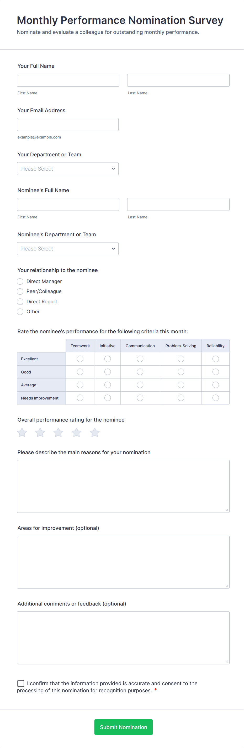 Monthly Performance Nomination Survey supports consistent employee recognition by collecting peer nominations and performance feedback in one place, making monthly reviews easier for HR teams and managers using Jotform for online data collection.
