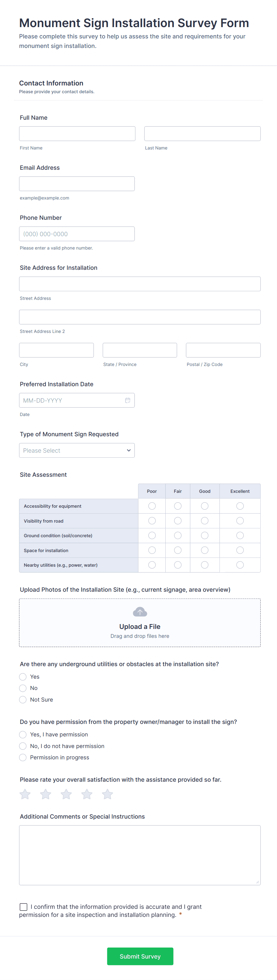 Construction Quality Control Survey Form helps contractors, engineers, and site inspectors document inspections, track workmanship issues, attach photos, and centralize quality data using a customizable Jotform survey template.