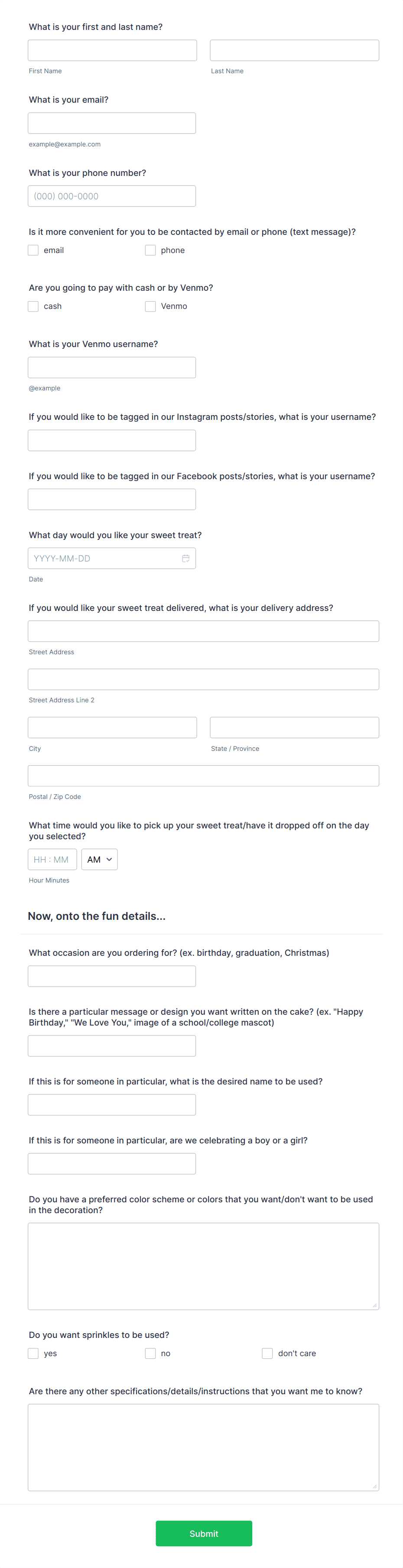 In summary, Cake Order Forms can be tailored to fit a wide range of business models and customer needs, ensuring efficient order management and a seamless experience for both the business and its clients.