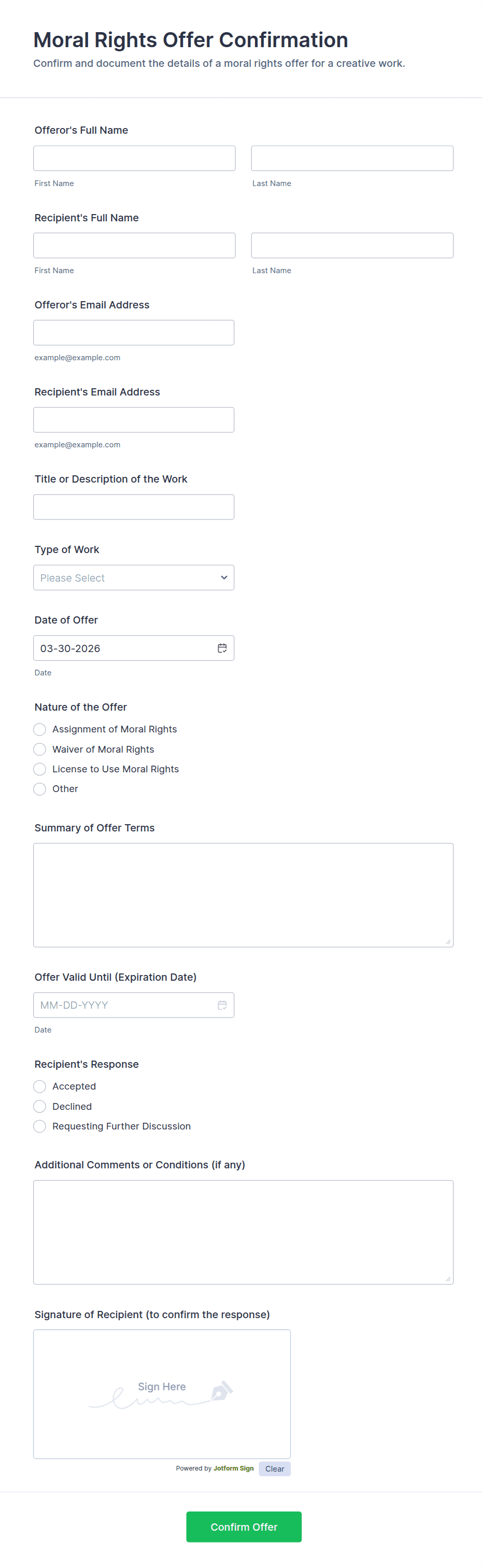 The form templates here are for informational purposes only. Jotform is not providing legal, financial, or other advice, or implying that the forms are legally valid in all or any jurisdictions. Before using any such form, consult an attorney and/or other applicable professionals to make sure that the form meets your needs, legally and otherwise.