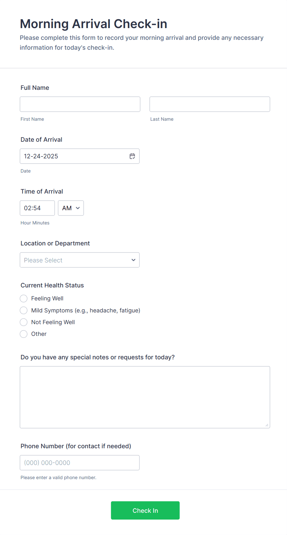 - Basic Fields: Name, email, phone number, date and time of check-in.