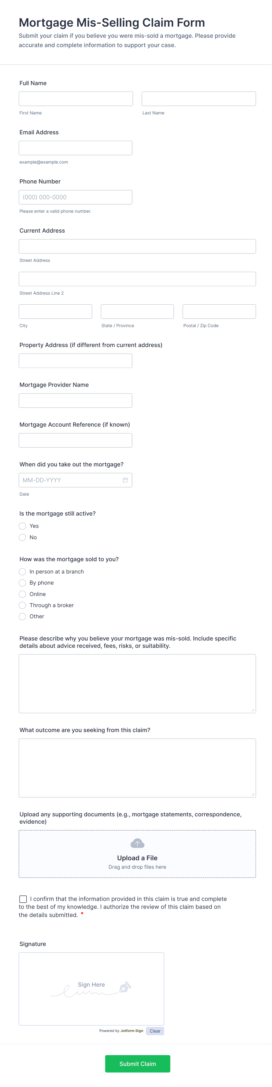 - Use Jotform’s conditional logic to show or hide fields based on user responses (e.g., only display additional fields if a certain claim type is selected).