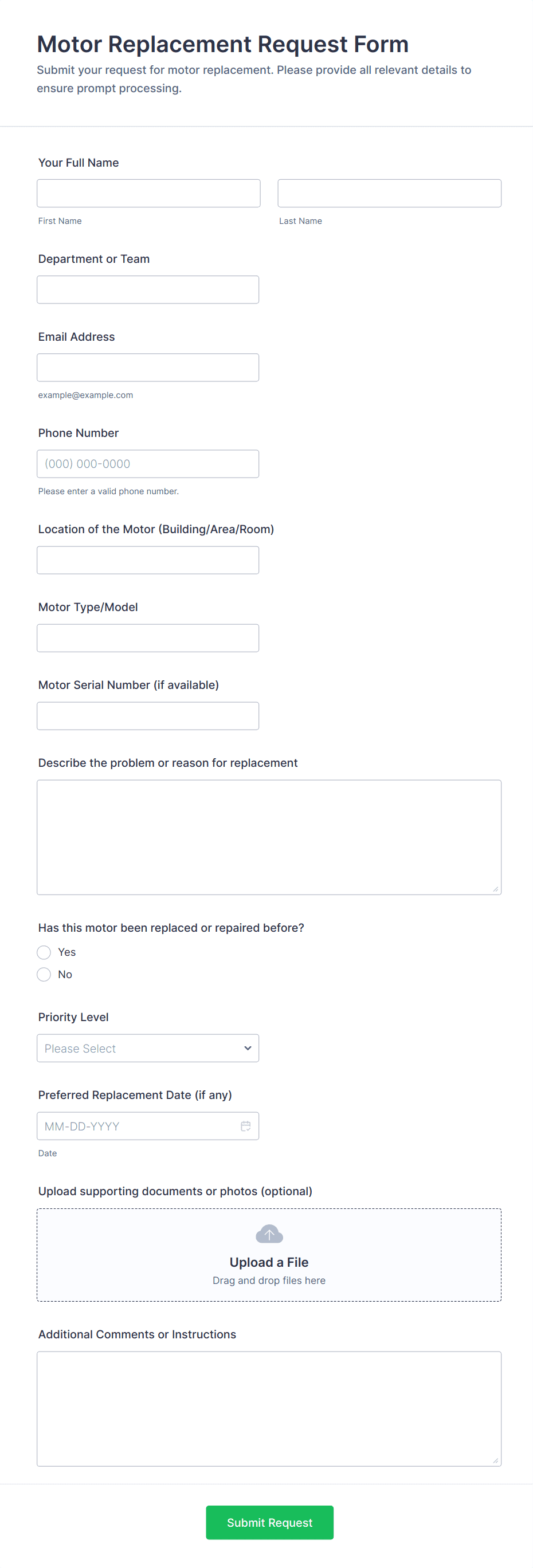 A maintenance request form is used by both property owners and building managers to identify maintenance issues and submit service requests. Easy to use. No coding.