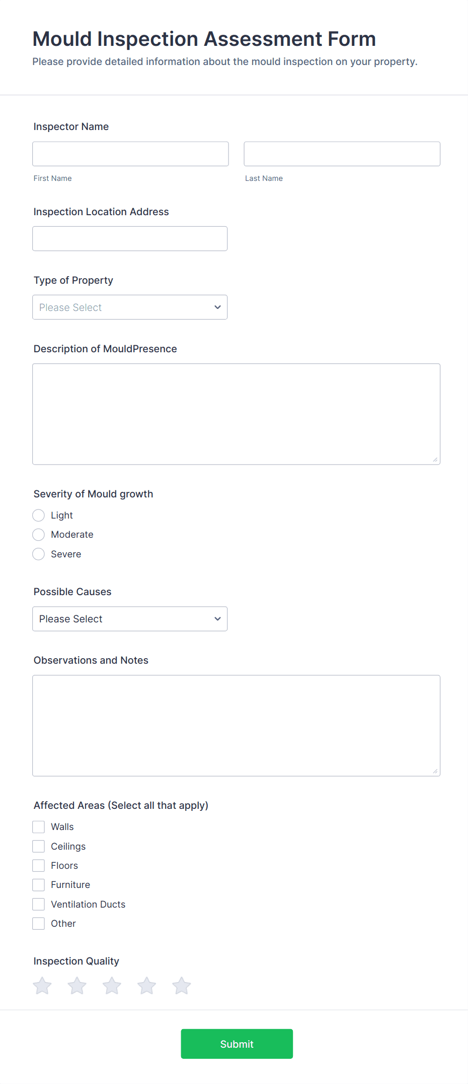 An inspection form is a structured document used to assess, record, and report the condition, compliance, or quality of assets, environments, or processes during an inspection.