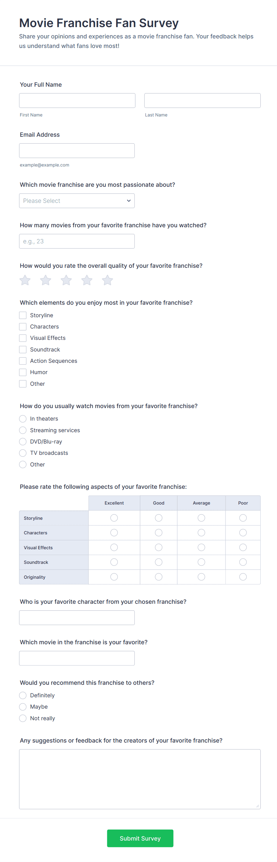 Entertainment Forms are specialized online forms designed to streamline processes within the entertainment industry, including event planning, talent management, audience engagement, and more. These forms can be used for a variety of purposes such as event registrations, ticket bookings, talent auditions, feedback collection, contest entries, and guest list management. Whether you’re organizing a concert, managing a film festival, running a comedy show, or hosting a virtual gaming tournament, Entertainment Forms help you efficiently gather and manage information from participants, attendees, and staff.
