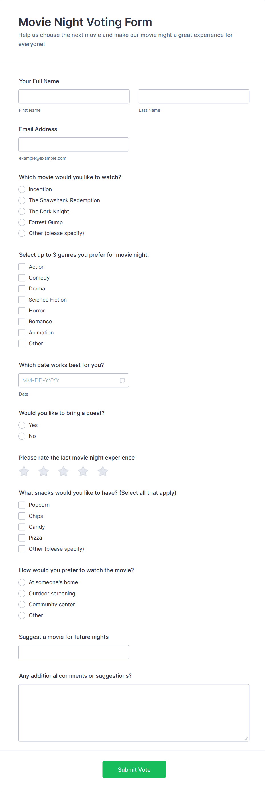 Voting forms are used by schools, businesses, clubs, nonprofits, event organizers, and any group needing to make collective decisions or gather opinions.