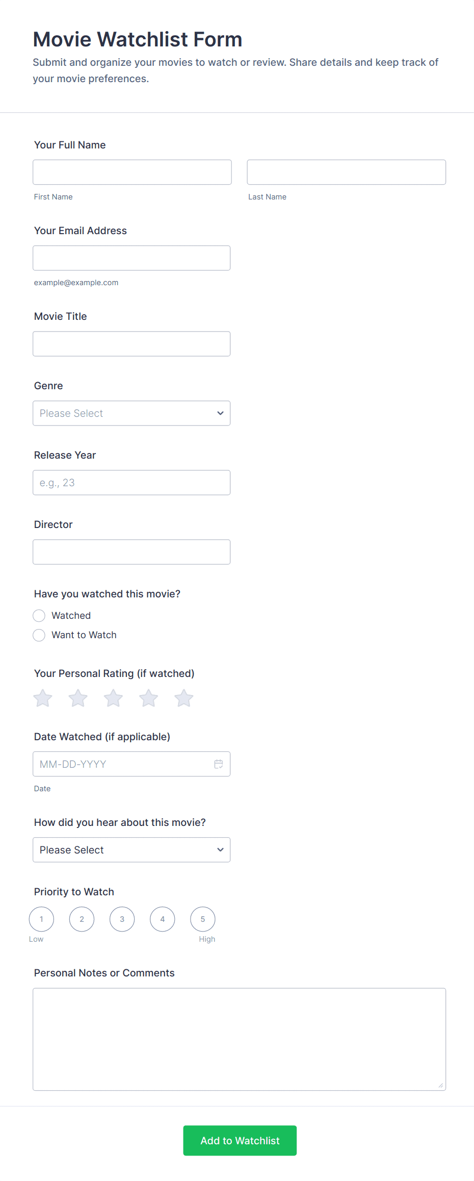 Entertainment Forms are specialized online forms designed to streamline processes within the entertainment industry, including event planning, talent management, audience engagement, and more. These forms can be used for a variety of purposes such as event registrations, ticket bookings, talent auditions, feedback collection, contest entries, and guest list management. Whether you’re organizing a concert, managing a film festival, running a comedy show, or hosting a virtual gaming tournament, Entertainment Forms help you efficiently gather and manage information from participants, attendees, and staff.