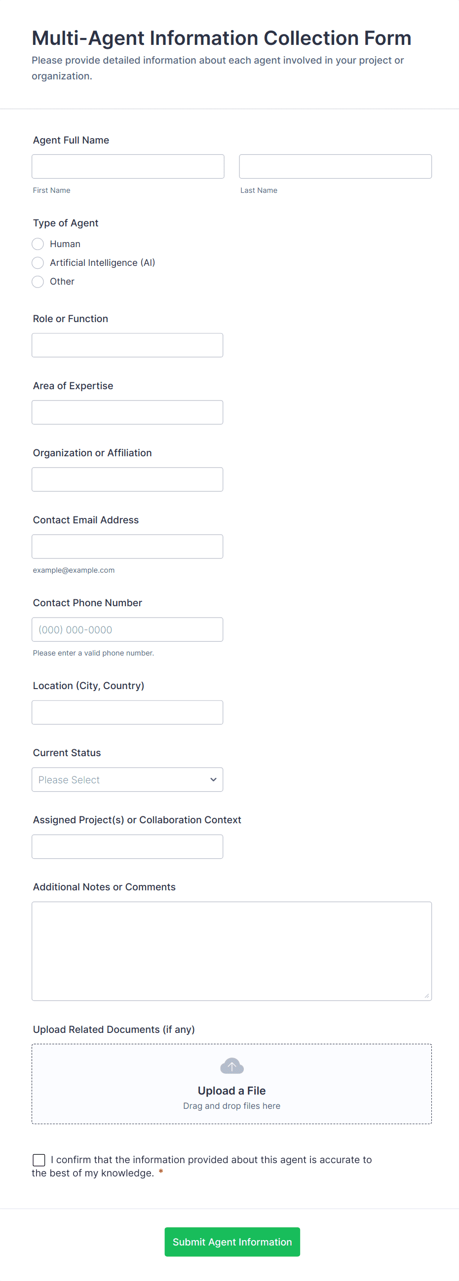 The form templates here are for informational purposes only. Jotform is not providing legal, financial, or other advice, or implying that the forms are legally valid in all or any jurisdictions. Before using any such form, consult an attorney and/or other applicable professionals to make sure that the form meets your needs, legally and otherwise.