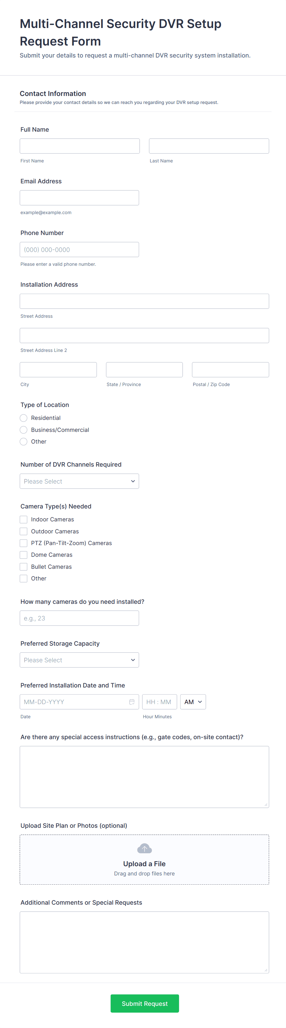 Common fields include requester’s name, contact details, department, type of request, detailed description, urgency, and any relevant attachments.