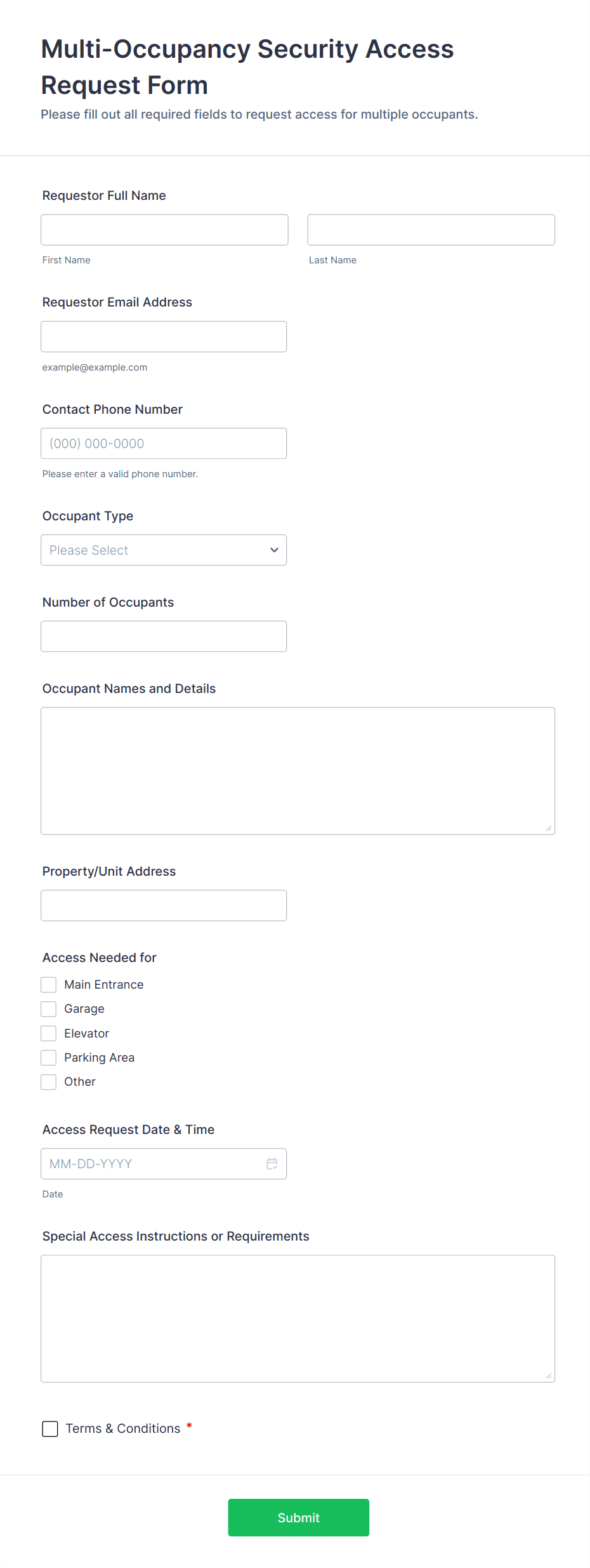 Add dropdowns for buildings, rooms, systems, or roles. Make access level fields structured so approvals are consistent.