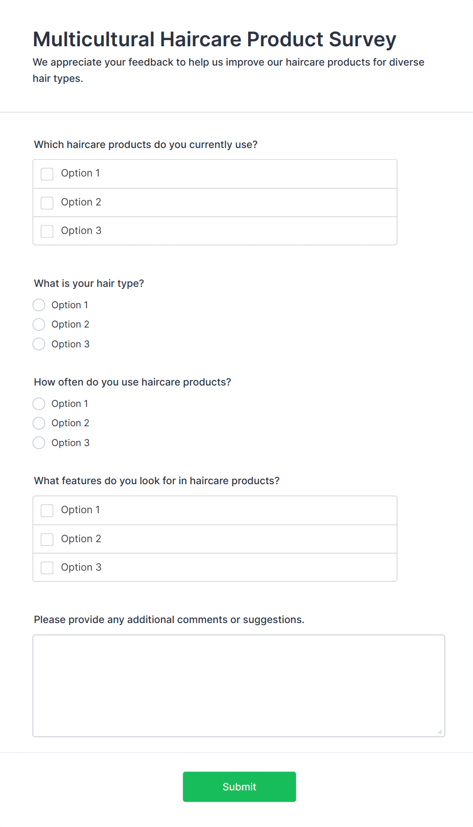 Product Survey Templates are pre-designed forms specifically created to help businesses, product managers, marketers, and researchers gather valuable feedback about products from customers, users, or stakeholders. These templates are used to assess customer satisfaction, collect suggestions for improvement, evaluate product features, and understand user experiences. Product survey forms can be utilized at various stages of a product’s lifecycle — from initial concept testing and beta launches to post-purchase feedback and ongoing product improvement. Common use cases include new product feedback, feature prioritization, usability testing, and post-launch satisfaction surveys.