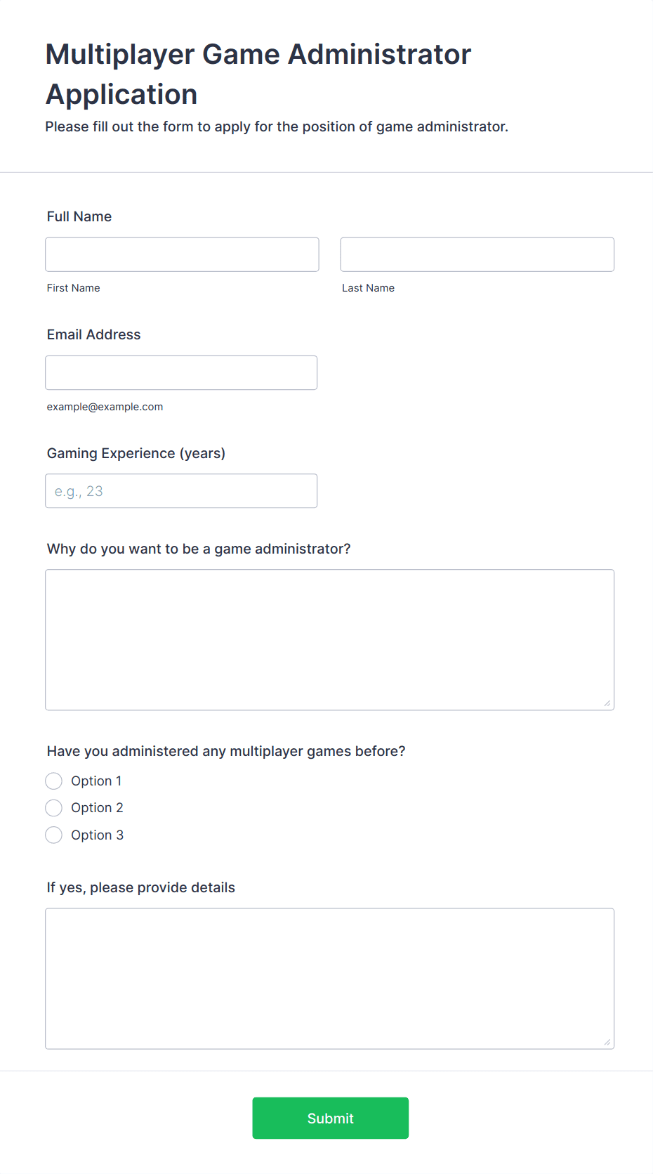 The Multiplayer Game Administrator Application form template is used to collect and evaluate applications from players who want to become admins or moderators for a multiplayer game, server, or community.