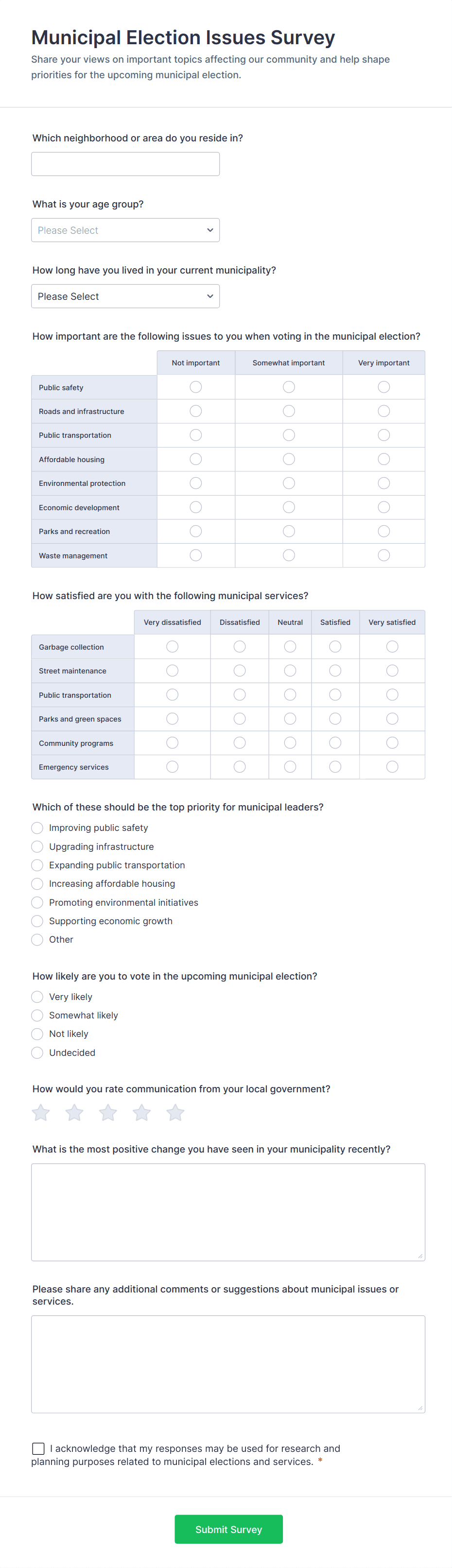 Voting forms are digital tools designed to collect, organize, and analyze votes or preferences from a group of participants. They are commonly used for elections, polls, surveys, award nominations, event planning, and decision-making processes in organizations, schools, clubs, and communities. Voting forms streamline the process of gathering input, whether it’s for selecting a new team leader, choosing a favorite project, or making group decisions efficiently. Their versatility makes them suitable for both formal elections and informal opinion polls, ensuring that every participant’s voice is heard and recorded accurately.