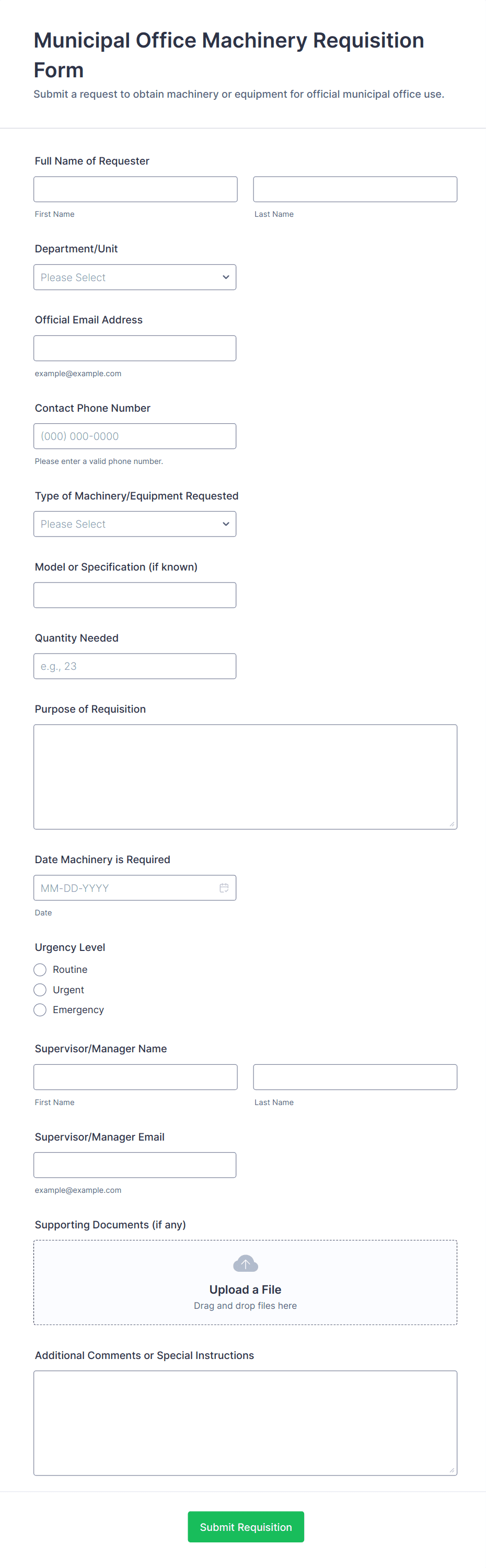 Collect requester name, role, department, and contact info so requests can be routed and fulfilled correctly.