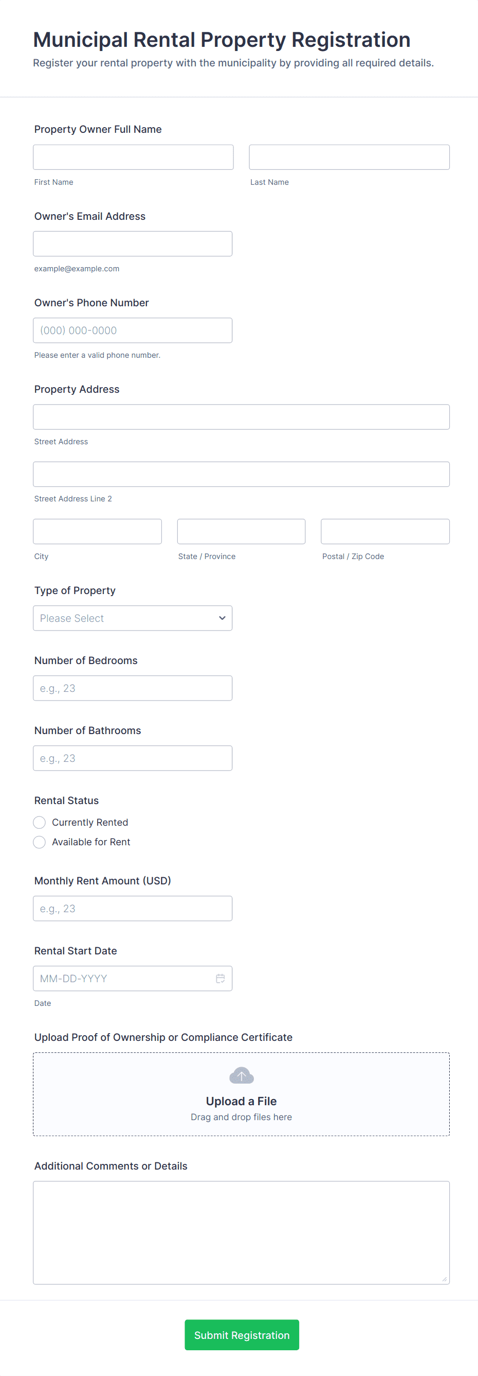 • Maintenance Requests: Tenant name, unit number, issue description, urgency level, file upload for photos.