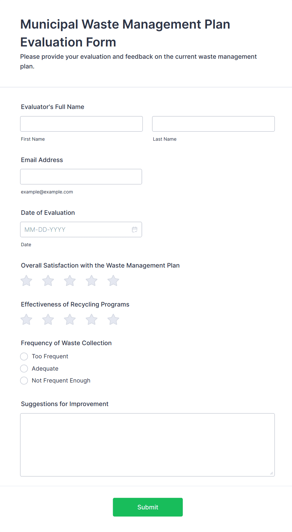 An evaluation survey form is a form template designed to collect information from students about their experience at the school, the quality of the education, and any suggestions for improvement.