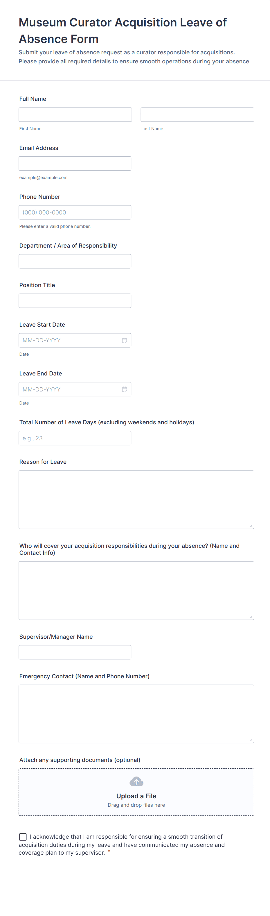 Common fields include employee name, department, type of leave, dates of absence, reason for leave, and any required supporting documentation.