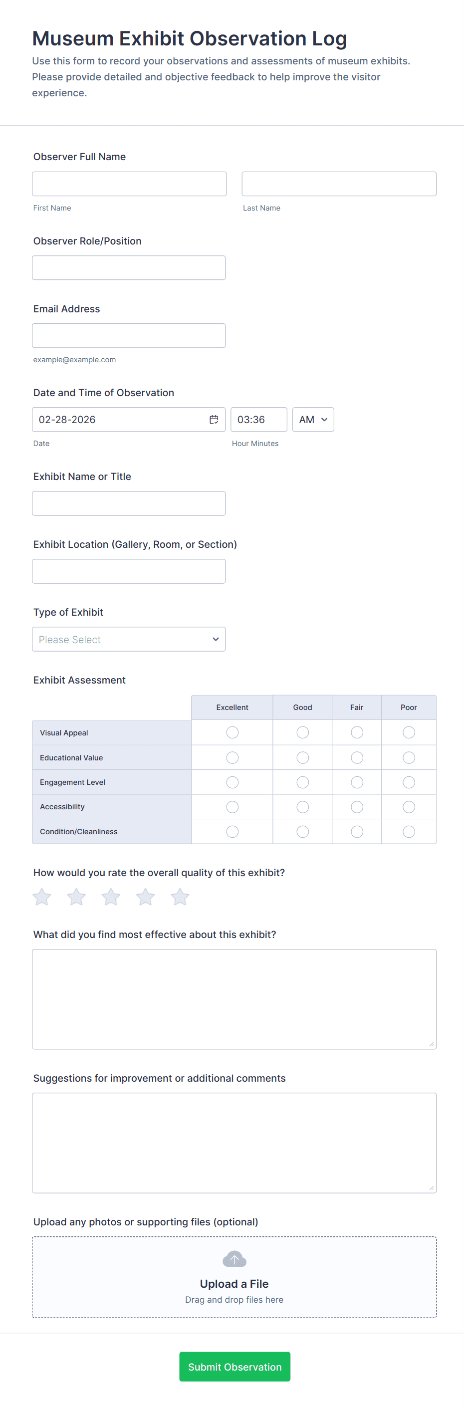 • For business reports: Include fields for dates, metrics, comments, and file uploads.