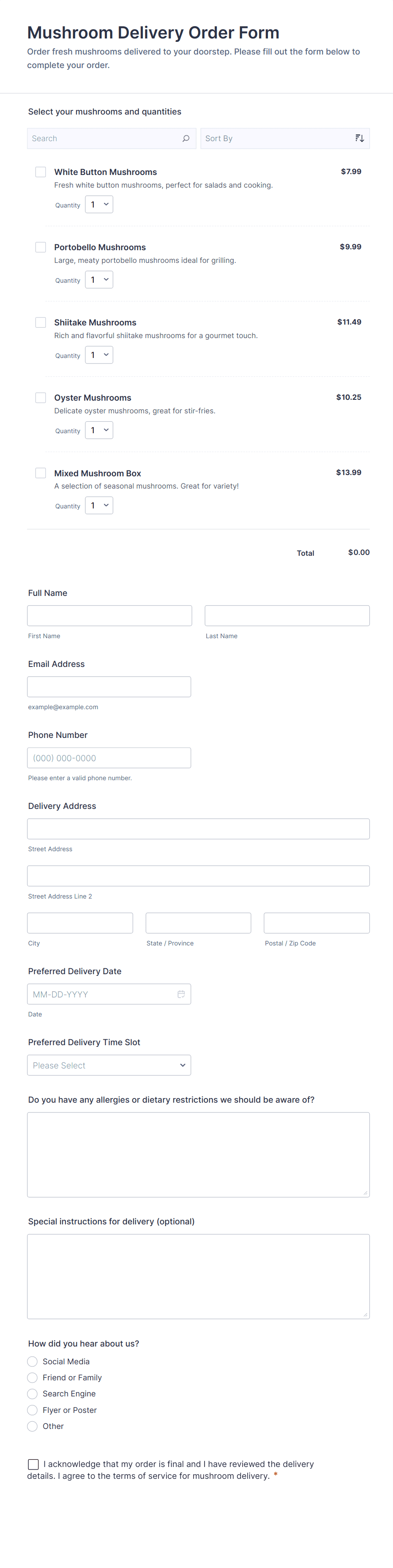 Free online order form for your meal kit delivery service. Easy to customize. Embed anywhere. Mobile-friendly. Integrate with 30+ payment gateways. No coding.