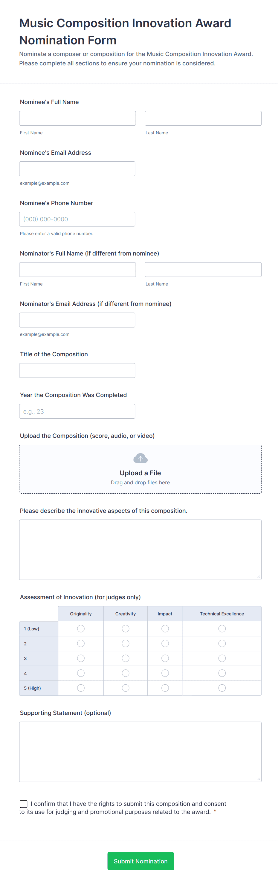 Nomination for Judicial Positions Form Template helps legal organizations and public bodies collect detailed, well-documented judicial nominations with qualifications, reasons, and supporting documents in one place.