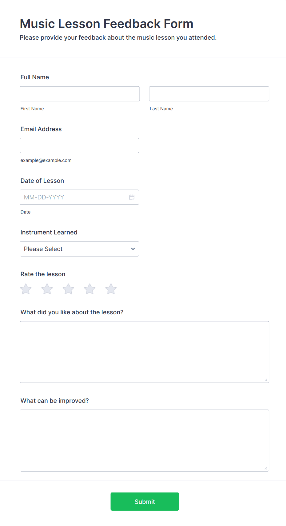 A feedback form is a structured questionnaire used to collect opinions, suggestions, and evaluations from respondents about a product, service, event, or experience.