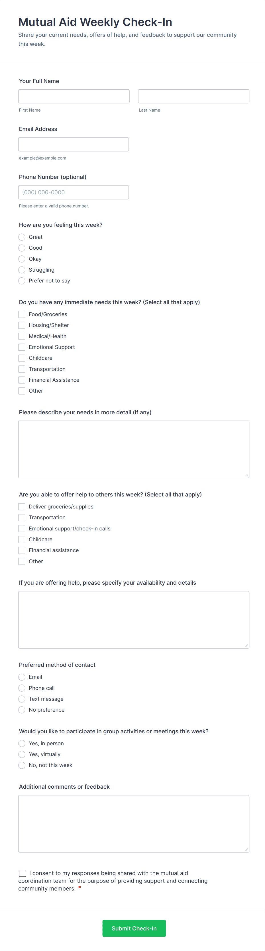 - Conditional Fields: Use conditional logic to display additional questions based on user responses (e.g., health screening for medical check-ins).
