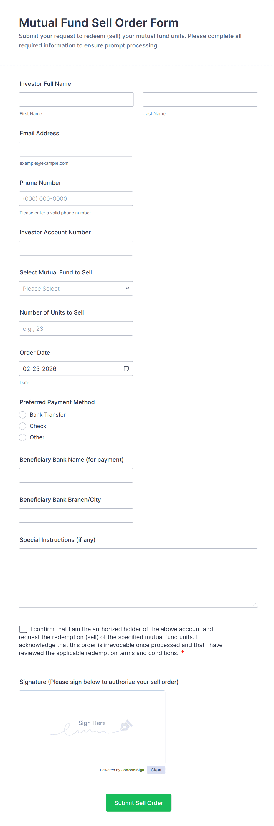The form templates here are for informational purposes only. Jotform is not providing legal, financial, or other advice, or implying that the forms are legally valid in all or any jurisdictions. Before using any such form, consult an attorney and/or other applicable professionals to make sure that the form meets your needs, legally and otherwise.