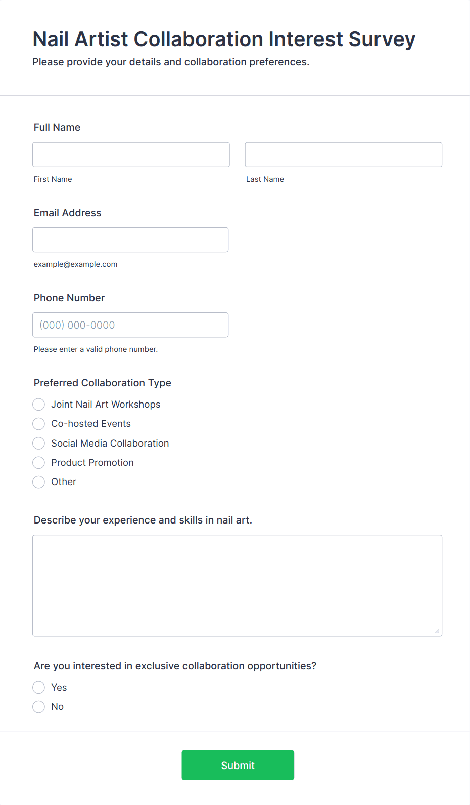 The Nail Artist Collaboration Interest Survey helps nail artists express their interest in partnerships and collaborations, allowing for effective data collection and insights.