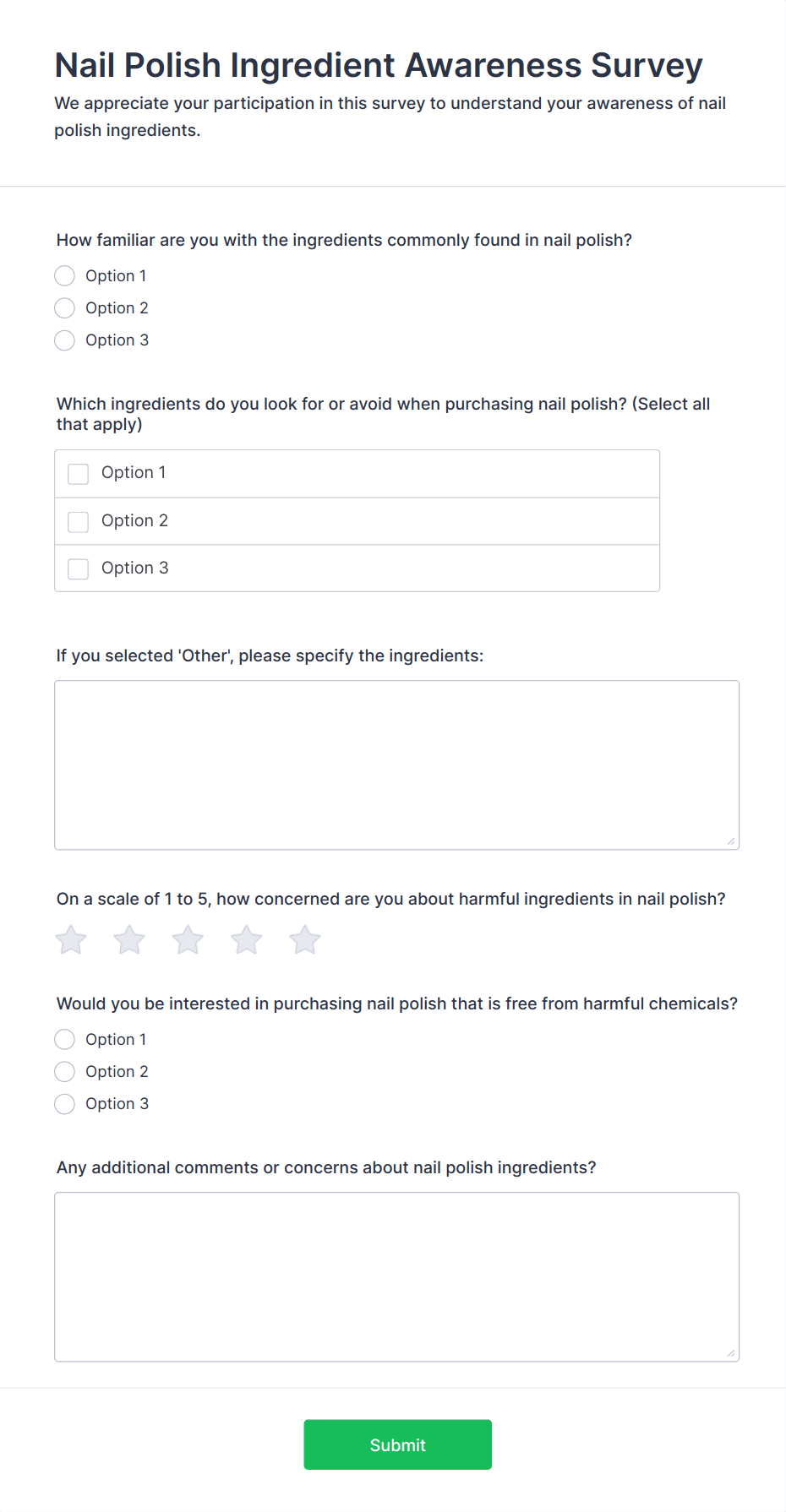 Product Survey Templates are pre-designed forms specifically created to help businesses, product managers, marketers, and researchers gather valuable feedback about products from customers, users, or stakeholders. These templates are used to assess customer satisfaction, collect suggestions for improvement, evaluate product features, and understand user experiences. Product survey forms can be utilized at various stages of a product’s lifecycle — from initial concept testing and beta launches to post-purchase feedback and ongoing product improvement. Common use cases include new product feedback, feature prioritization, usability testing, and post-launch satisfaction surveys.