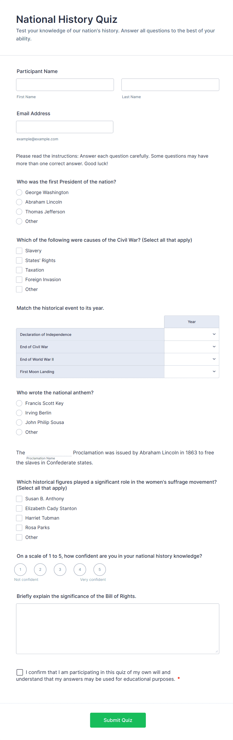 Test students on their history knowledge with this free, customizable online quiz template. No coding. Easy to embed and integrate. Perfect for online classes!