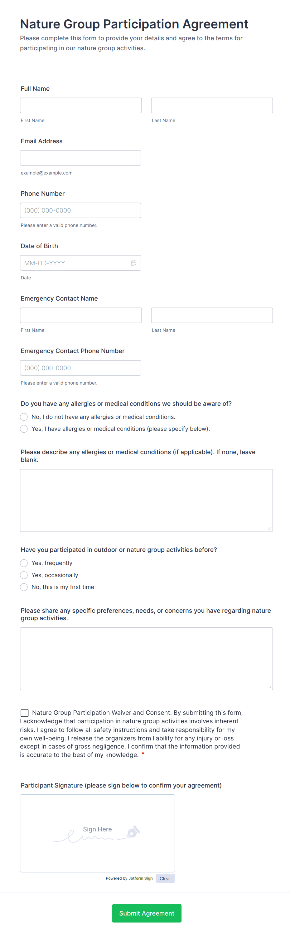 Outdoor Activity Terms Agreement Form helps camps, schools, clubs, and tour operators collect participant consent, emergency contacts, and signatures online before outdoor events.