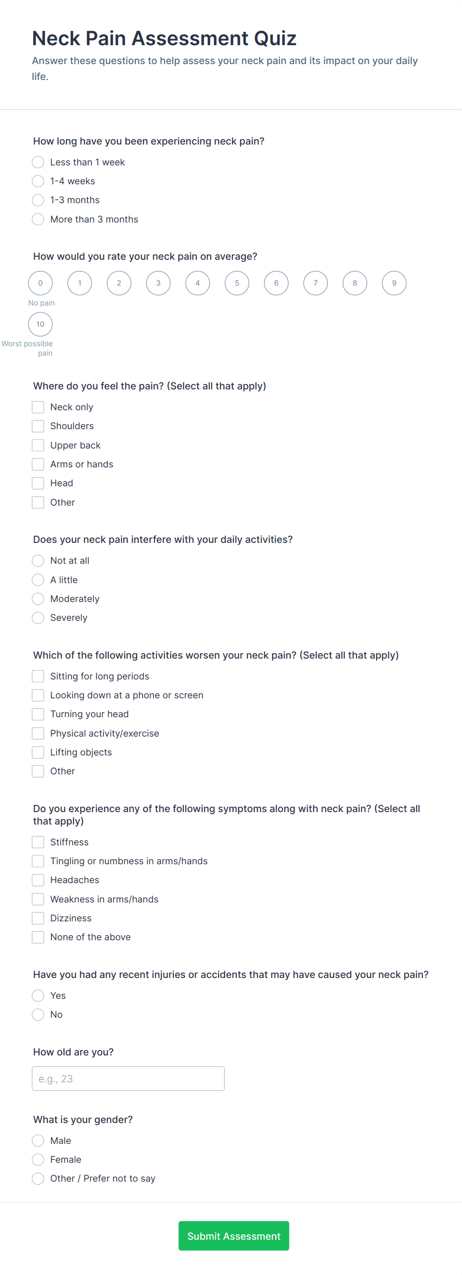 Add fields for symptoms, medical history, medications, allergies, lifestyle factors, and functional status depending on the assessment type. Use rating scales for severity and impact.