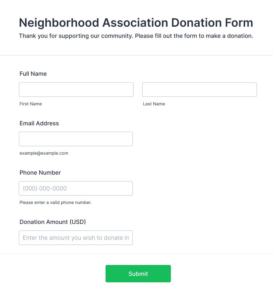 Donation forms are specialized online forms designed to collect contributions for charitable organizations, fundraising campaigns, nonprofit initiatives, and community projects. These forms streamline the process of gathering donor information, processing payments, and tracking contributions, making it easier for organizations to raise funds efficiently. Donation forms can be used for a variety of purposes, such as one-time or recurring donations, event sponsorships, crowdfunding efforts, membership drives, and emergency relief campaigns. They are essential tools for nonprofits, schools, religious groups, and community organizations seeking to engage supporters and facilitate secure, convenient giving.