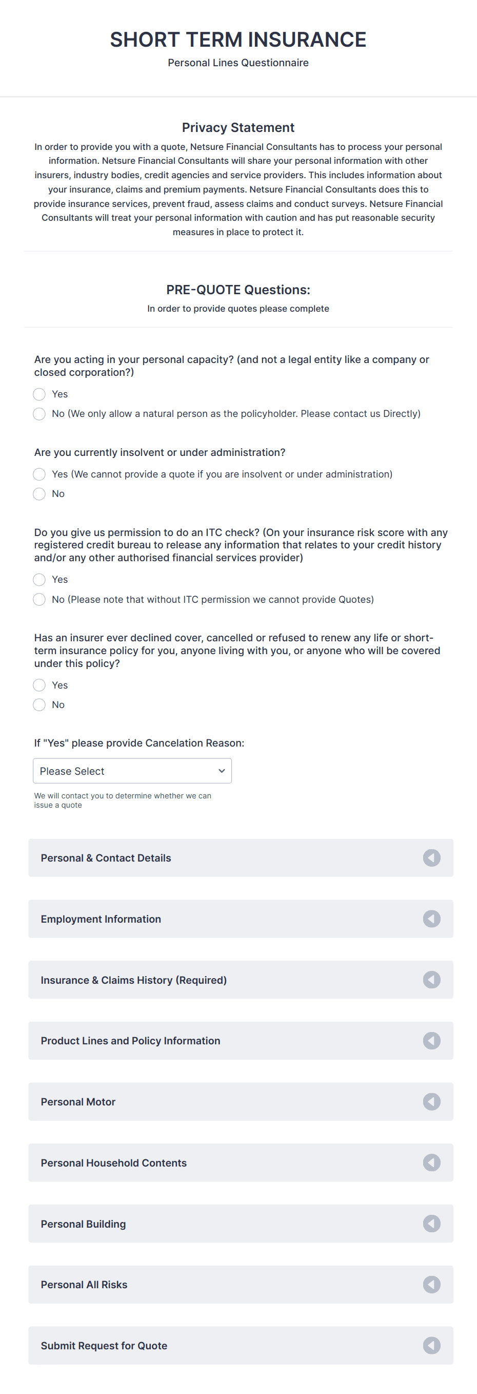 An auto insurance quote form is a questionnaire used by potential clients to get quotes for their car insurance. Fully customizable without any coding.