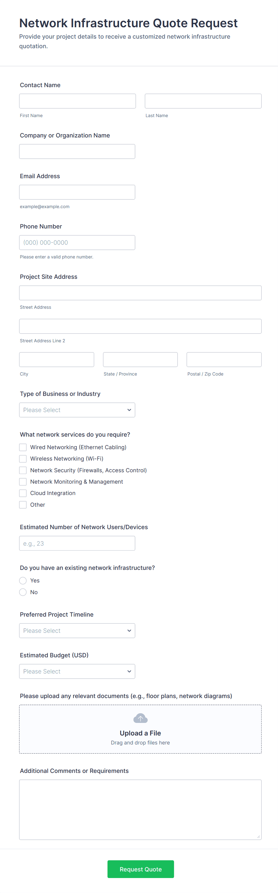 Infrastructure forms are structured documents used to request, track, and document infrastructure work such as IT infrastructure changes, facility upgrades, network setup, and operational improvements. They help teams collect consistent details about infrastructure needs, scope, timelines, risk, approvals, and implementation steps so changes can be planned and executed safely. Infrastructure forms are commonly used by IT teams, facilities departments, operations teams, and project managers for requests like network provisioning, server changes, hardware installation, building utilities maintenance, and site readiness planning. By standardizing infrastructure workflows, these forms reduce miscommunication, improve accountability, and create clear records for audits and follow-up.