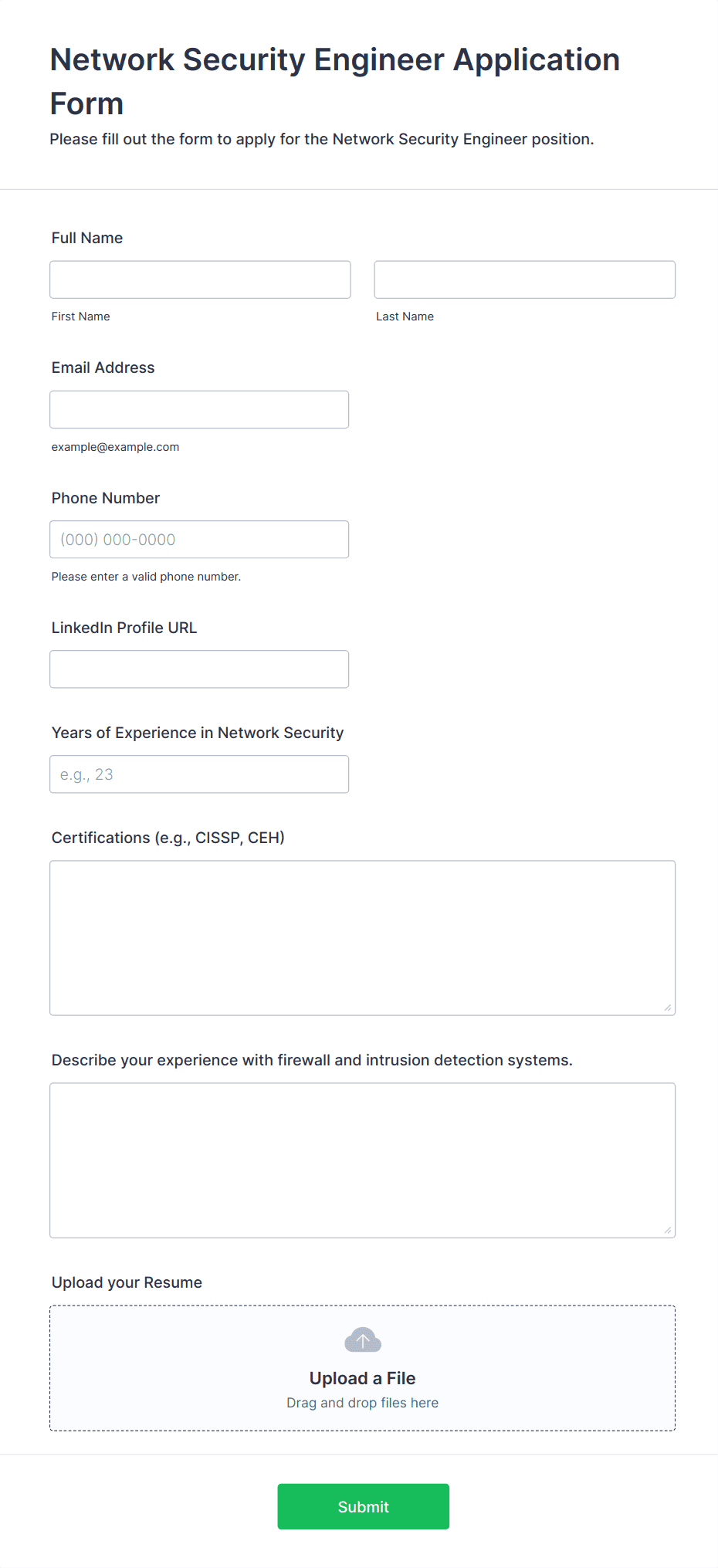 • For job applications, include fields for personal information, education, work experience, references, and file uploads for resumes or cover letters.