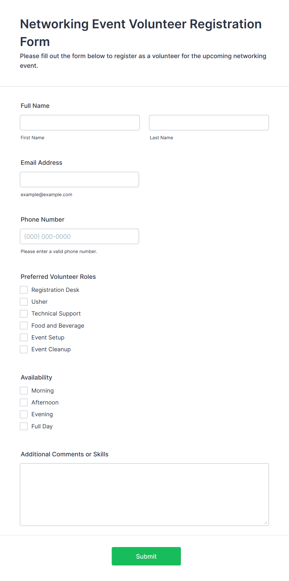 Volunteer Registration Forms are digital tools designed to collect essential information from individuals interested in volunteering for various organizations, events, or causes. These forms streamline the process of gathering volunteer details such as contact information, availability, skills, interests, and emergency contacts. They are widely used by nonprofits, community groups, schools, event organizers, and religious organizations to efficiently manage volunteer sign-ups for activities like charity events, fundraisers, disaster relief efforts, and ongoing community programs. By centralizing volunteer data, these forms help organizations match volunteers to suitable roles, ensure compliance with safety protocols, and maintain organized records for future engagement.