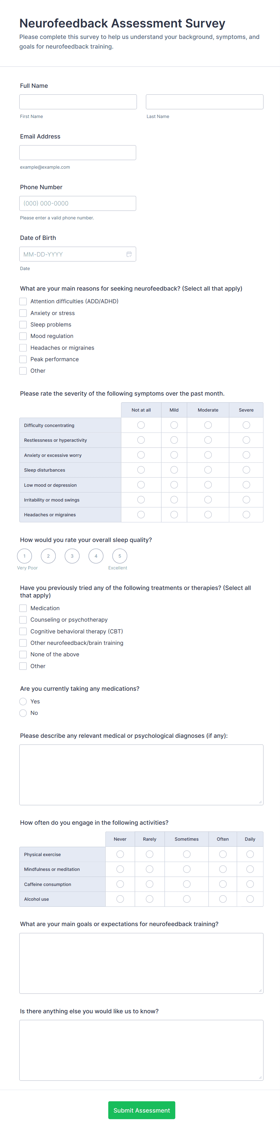 Add fields for symptoms, medical history, medications, allergies, lifestyle factors, and functional status depending on the assessment type. Use rating scales for severity and impact.
