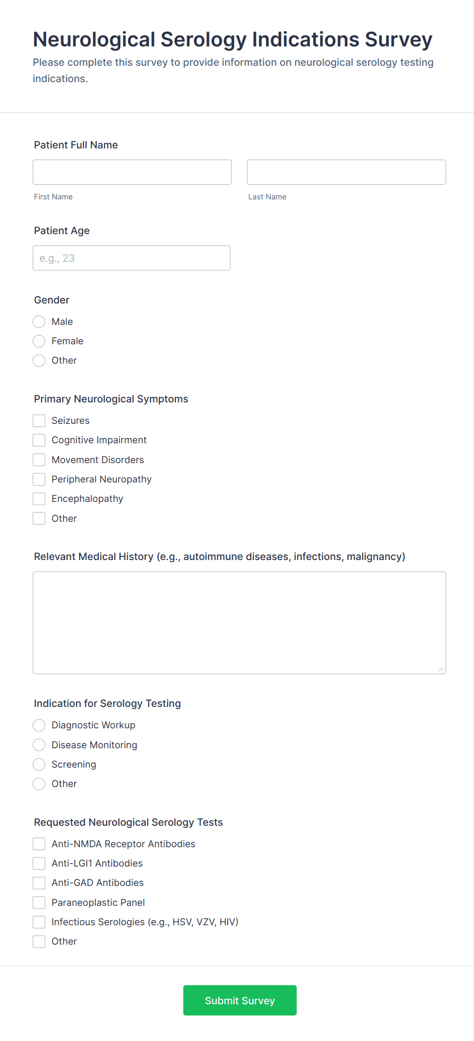 Medical surveys and questionnaires are essential tools used by healthcare professionals, researchers, clinics, and organizations to collect valuable information about patients’ health, medical histories, symptoms, treatment outcomes, and overall well-being. These forms can be used for a variety of purposes, such as patient intake, health risk assessments, satisfaction surveys, mental health screenings, post-visit feedback, and clinical research studies. By gathering structured data directly from patients or study participants, medical surveys and questionnaires help streamline workflows, improve patient care, and support evidence-based decision-making in healthcare settings.